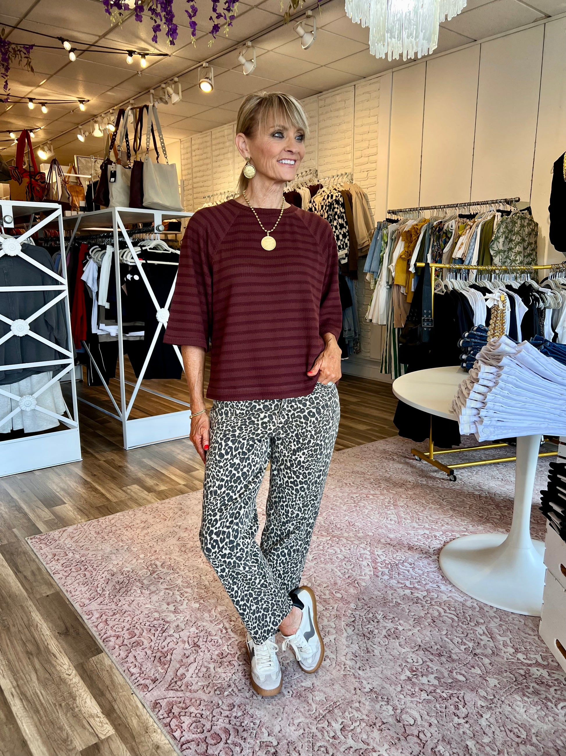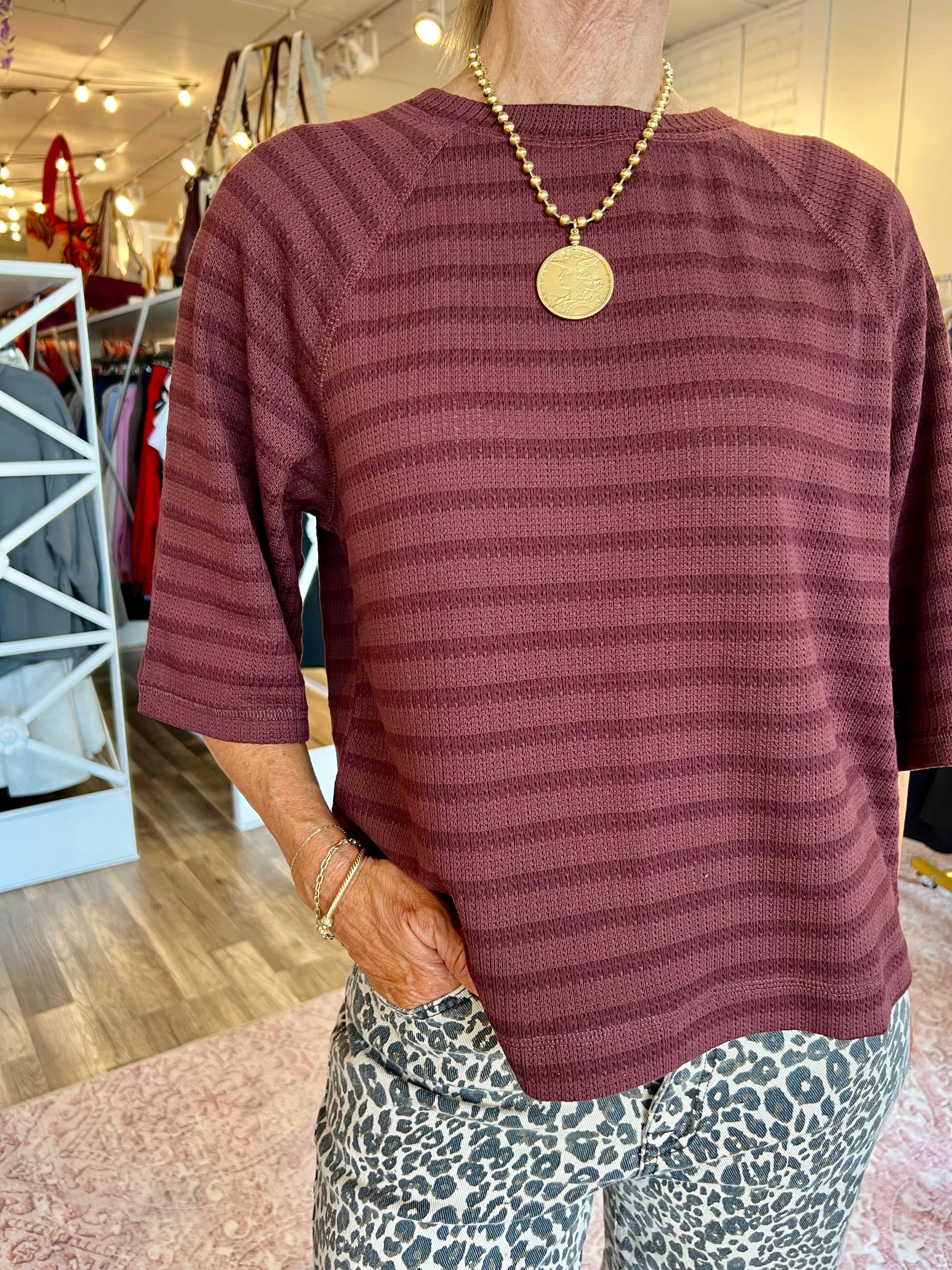 This relaxed-fit tee features a flattering boxy cut and subtle ribbed texture for a touch of sophistication. The rich maroon color is perfect for fall, and the easy short sleeves make it ideal for layering or wearing on its own. Dress it up with jewelry or keep it casual with your favorite jeans – this versatile top is a must-have for your wardrobe!