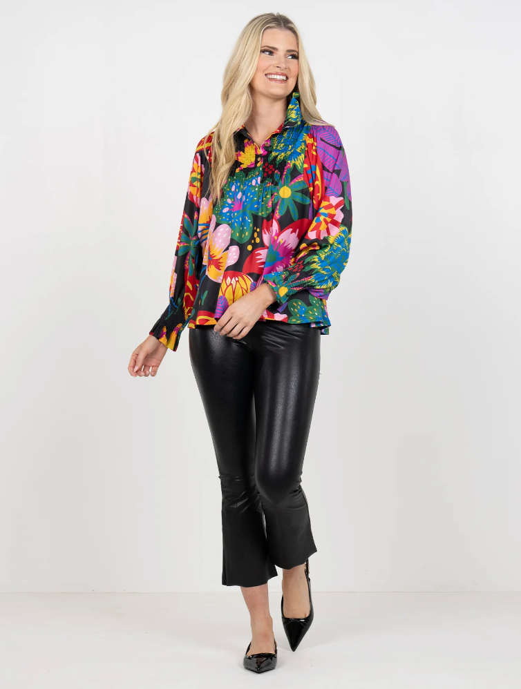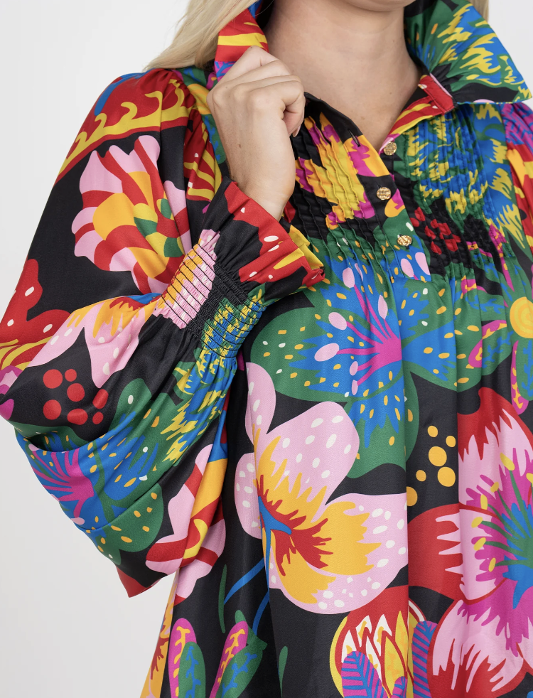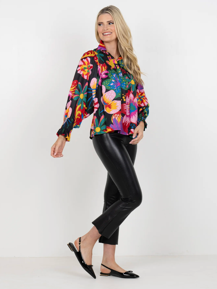 The Charlotte Top in Midnight Garden features a ruffled stand collar, pin tuck pleats, smocked sleeves with ruffle cuffs, and a partial button front closure. Designed in a loose-fitting silhouette, this style highlights the Midnight Garden print—where vivid botanicals bloom across a moody backdrop, creating a dreamlike mix of bold and whimsy.