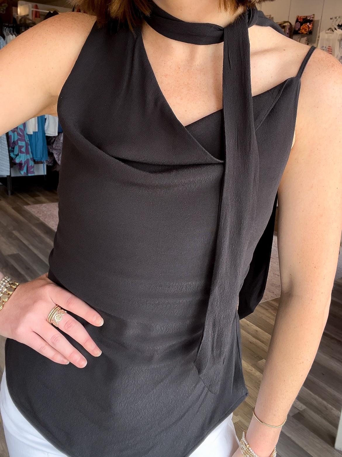 This stylish tank is perfect for your next night out! The cowl neckline is flattering and comes with an attached neck scarf. The scarf can be tied multiple ways to customize your look. Features an adjustable spaghetti strap and smocking across the back for a tailored fit.