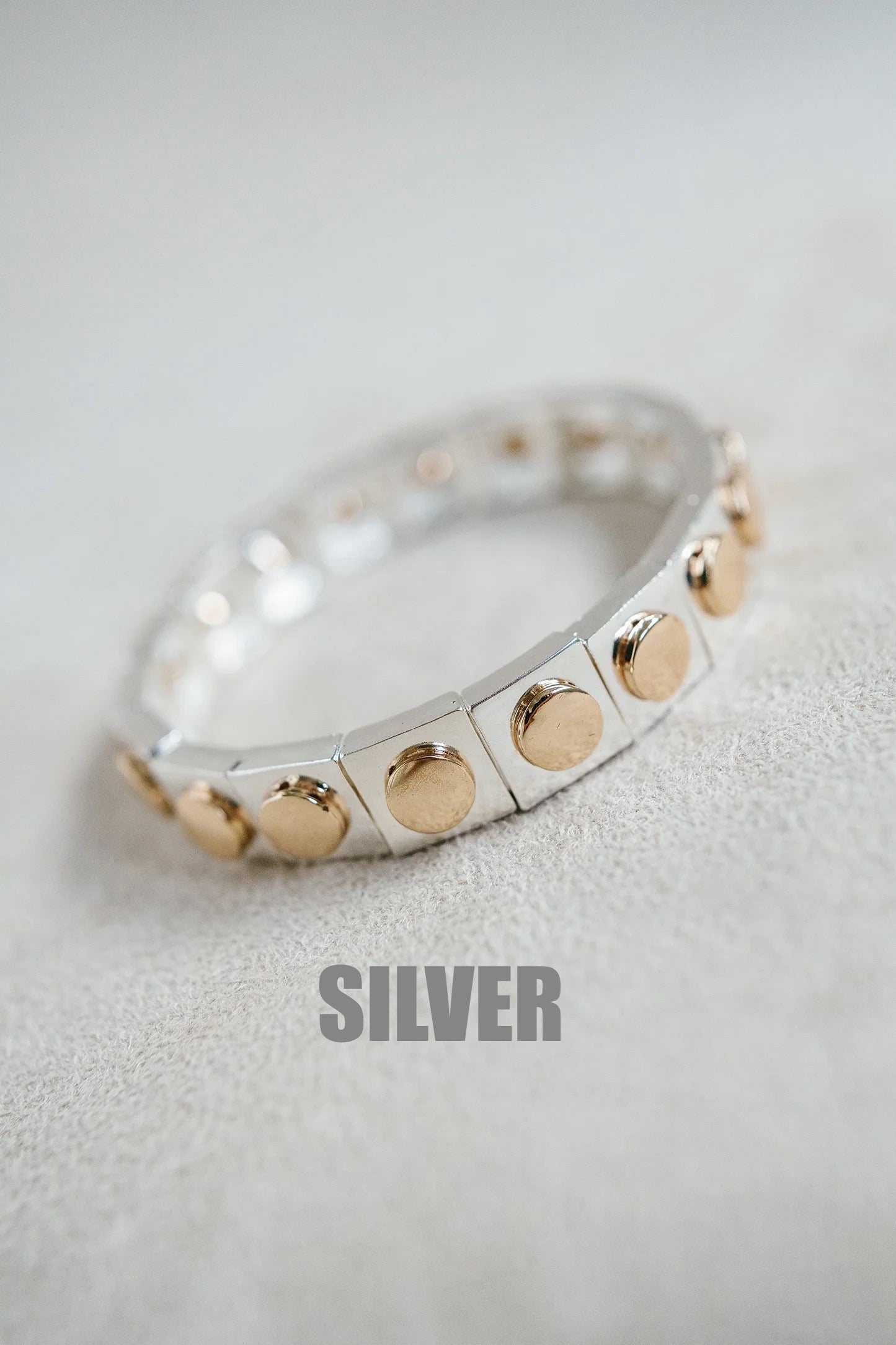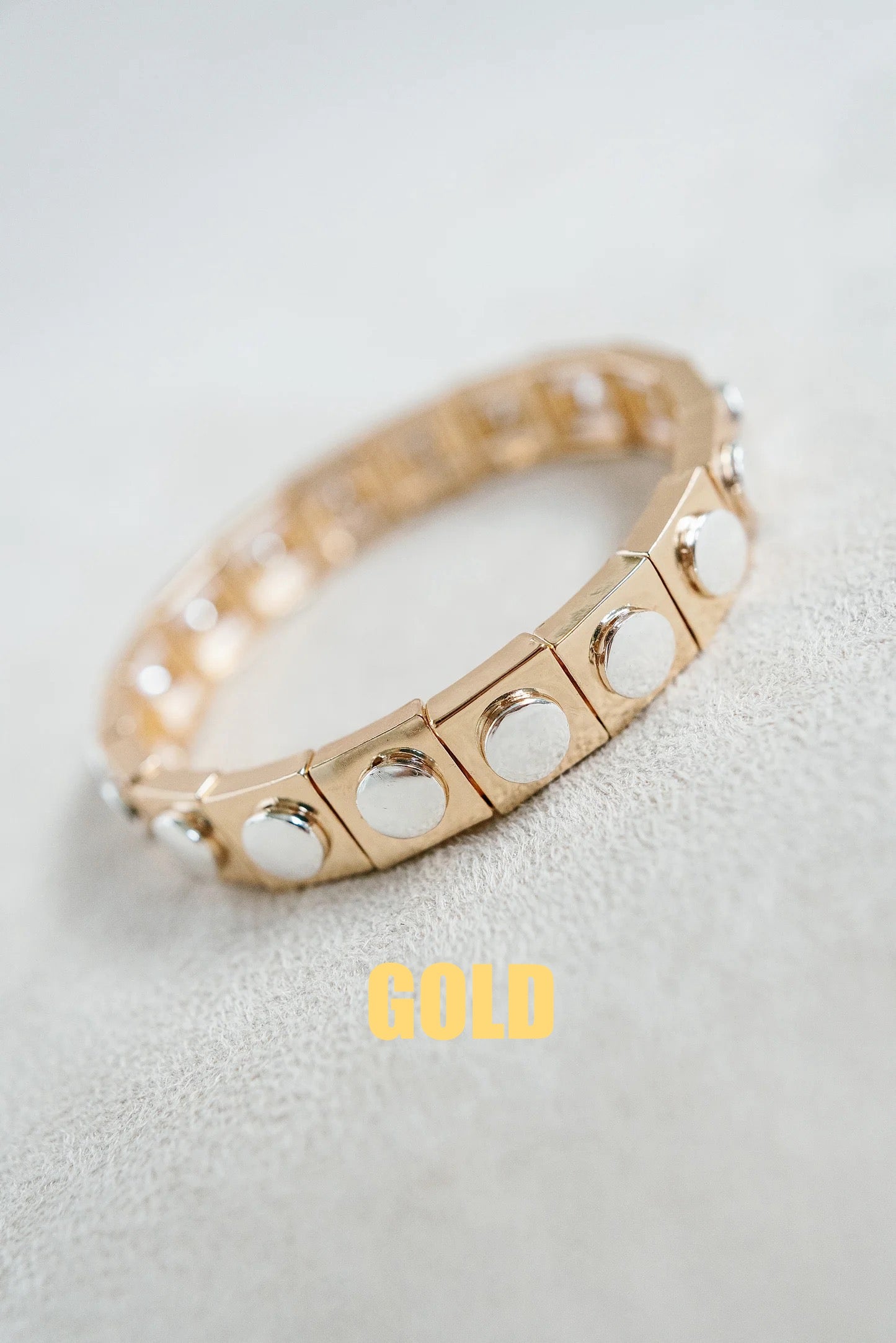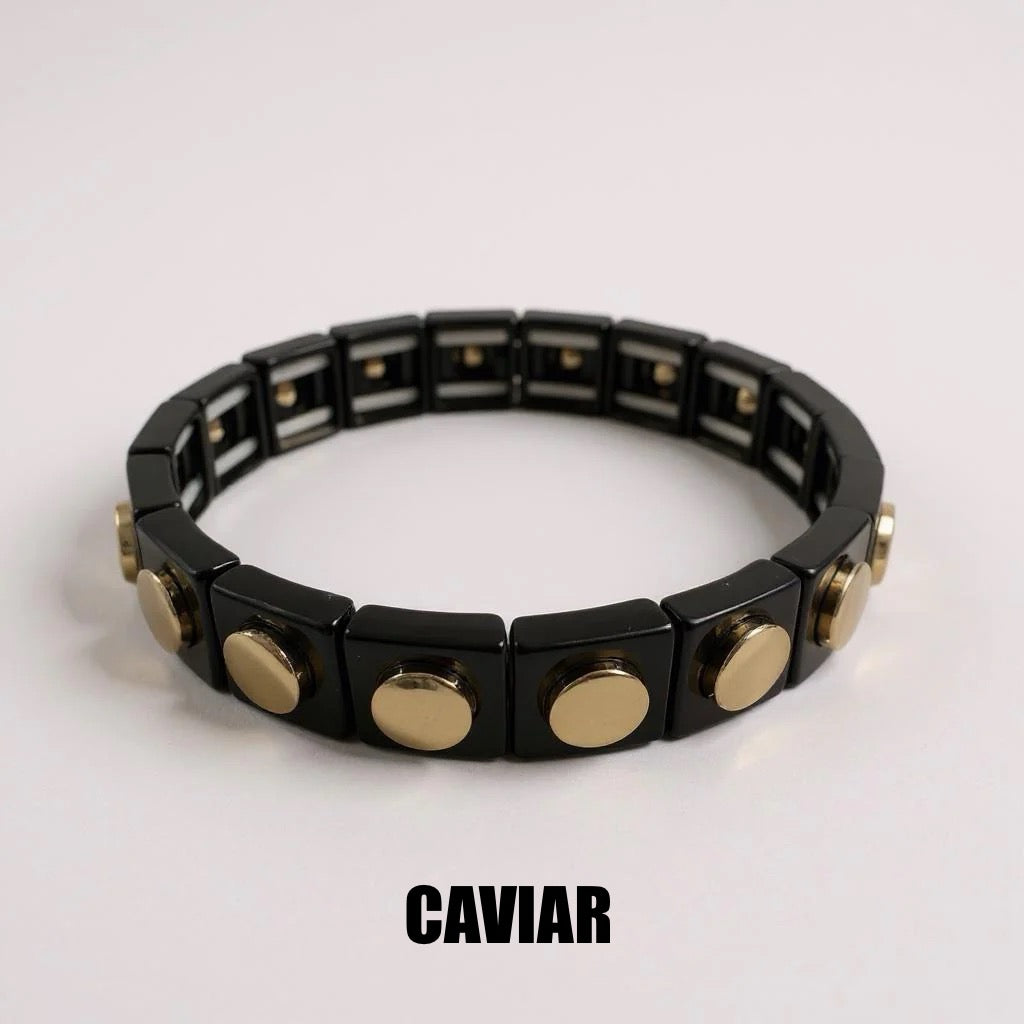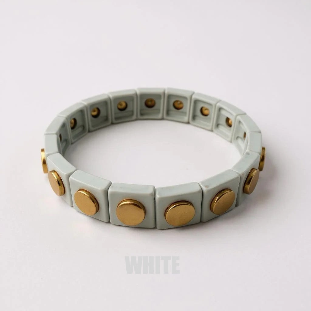 Enamel coated stretch bracelet with 14K gold plated stud detail.