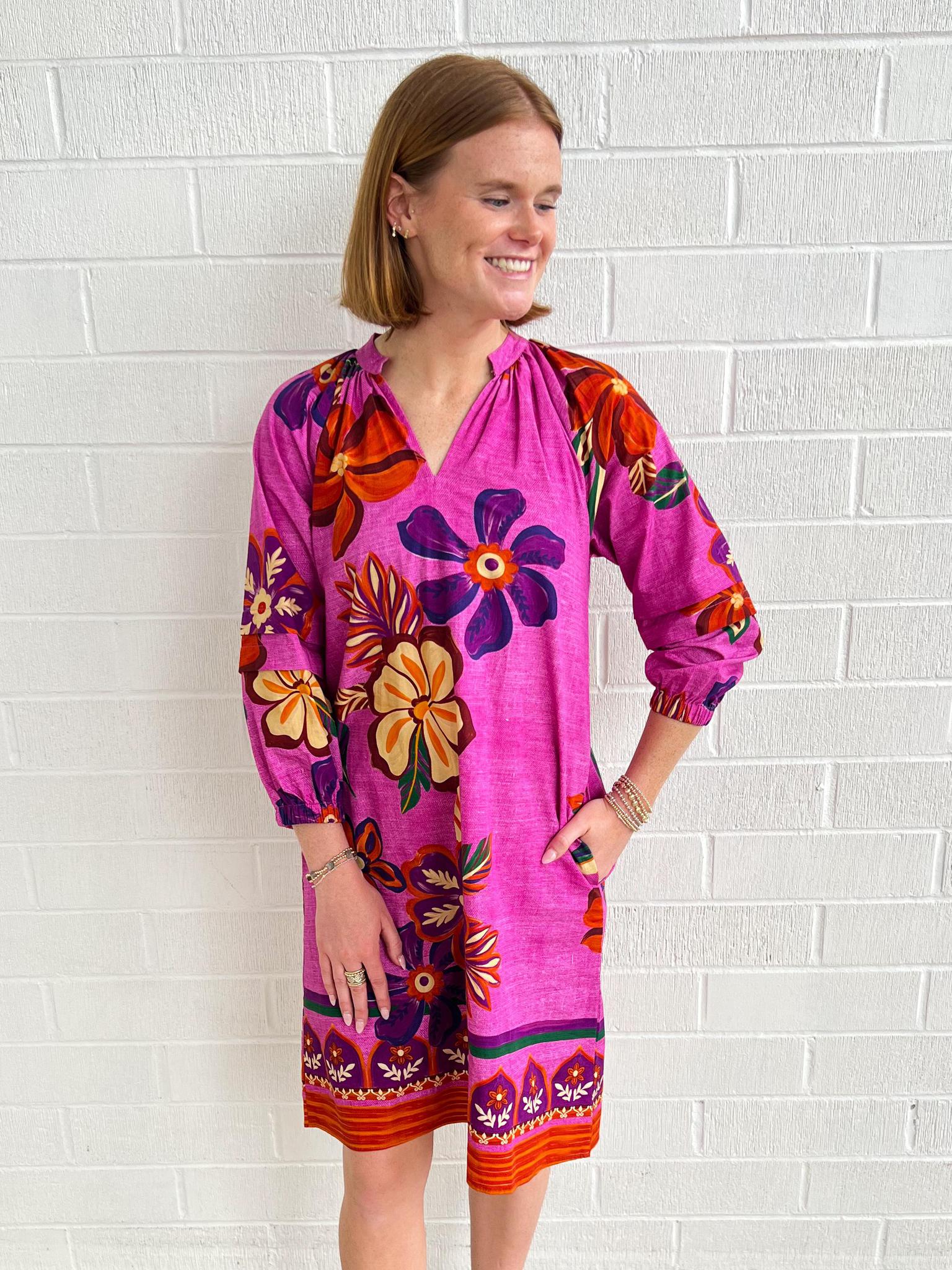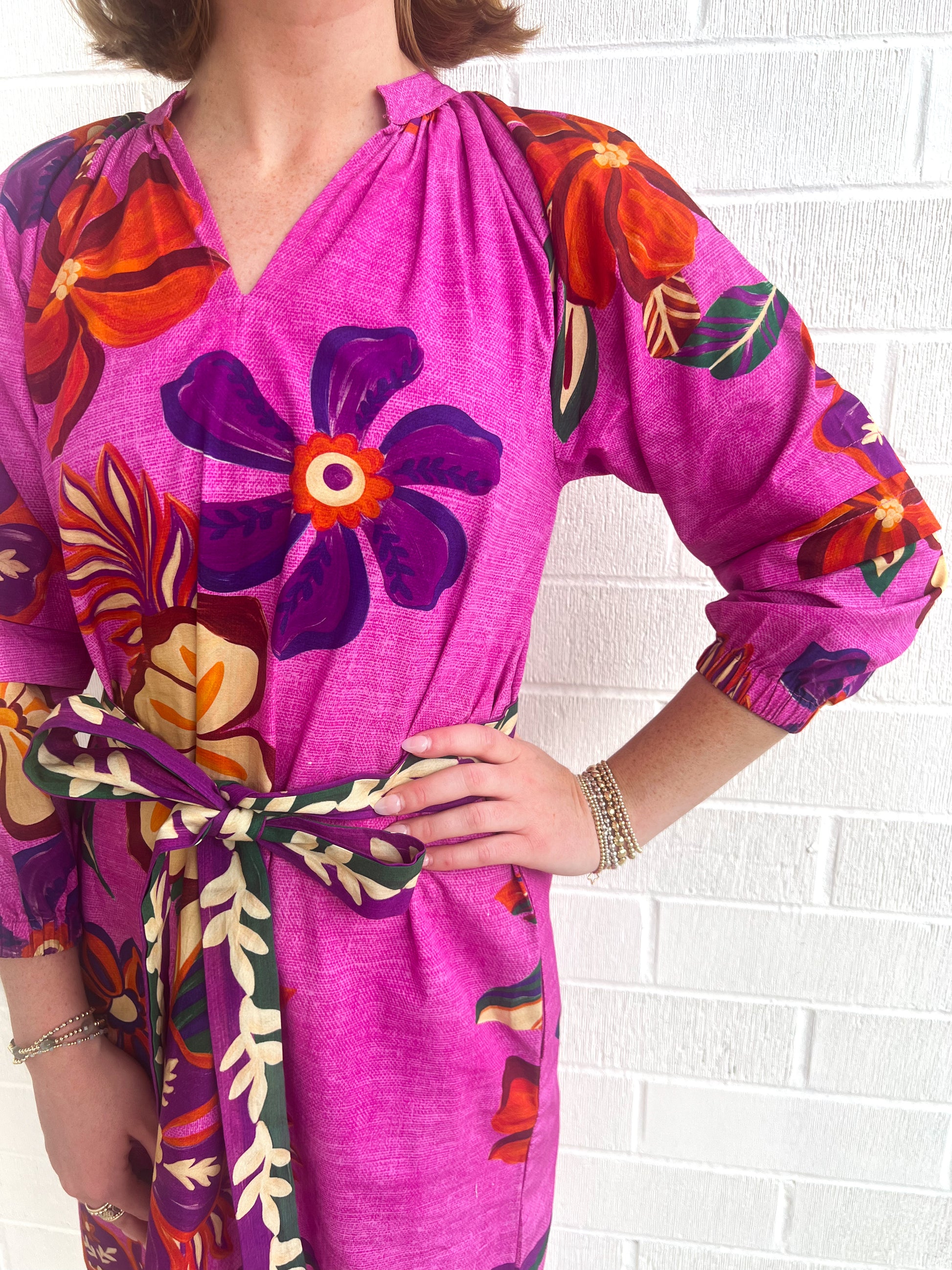 The Gia dress is a must-have for your wardrobe! Featuring a V-neck, belted option, 3/4 sleeves with a gathered detail at the shoulders, and a gorgeous all-over floral print with a detailed hemline, this dress is perfect for any occasion. The soft fabric ensures comfort all day long.