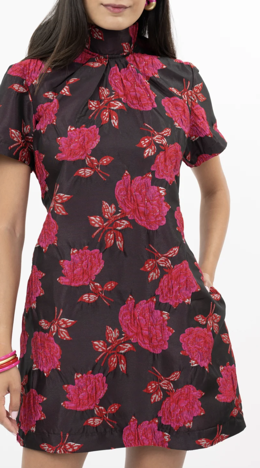 Beautiful floral damask pattern with a slight metallic threading throughout. The back is a WOW with the beautiful bow back. Has pockets and runs true to size.