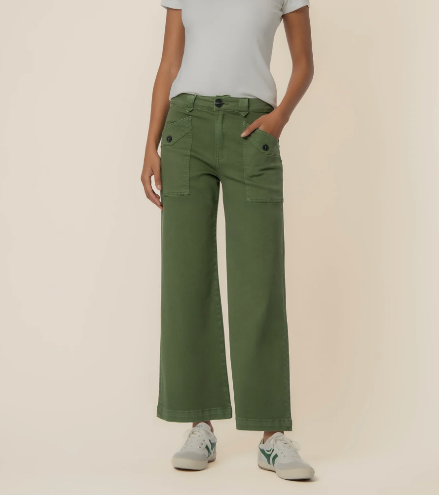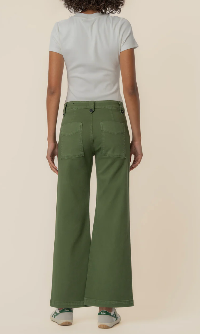 - High-rise jeans designed with a relaxed wide-leg silhouette for an effortlessly modern look. Made from stretchy, comfortable material that moves with you, they feature distinctive porkchop pockets and a rich dill-green color that adds a fresh twist to a classic style.
