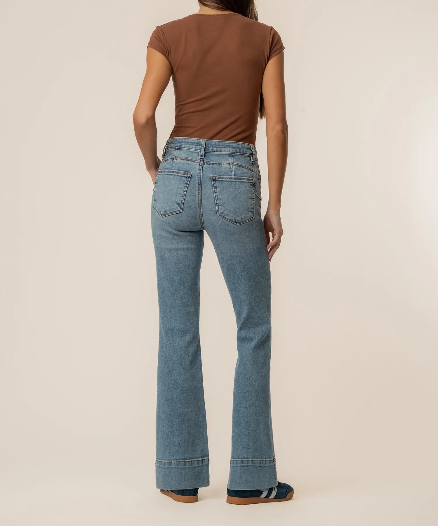 Make a statement in these high-rise flare jeans, designed to flatter and elongate. Featuring built-in Fab Ab pockets for a smooth, supportive fit, they combine style with confidence-boosting comfort. The dramatic flare silhouette flows into a bold wide hem for a modern, leg-lengthening finish. Crafted from very stretchy material and finished in a versatile medium base wash, these jeans deliver all-day comfort with standout style.