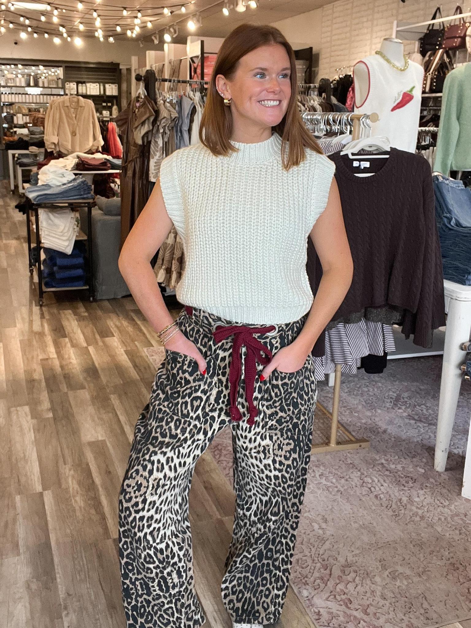 Adorable leopard print barrel jeans! Features maroon tie belt with grommet detailing. True to size.