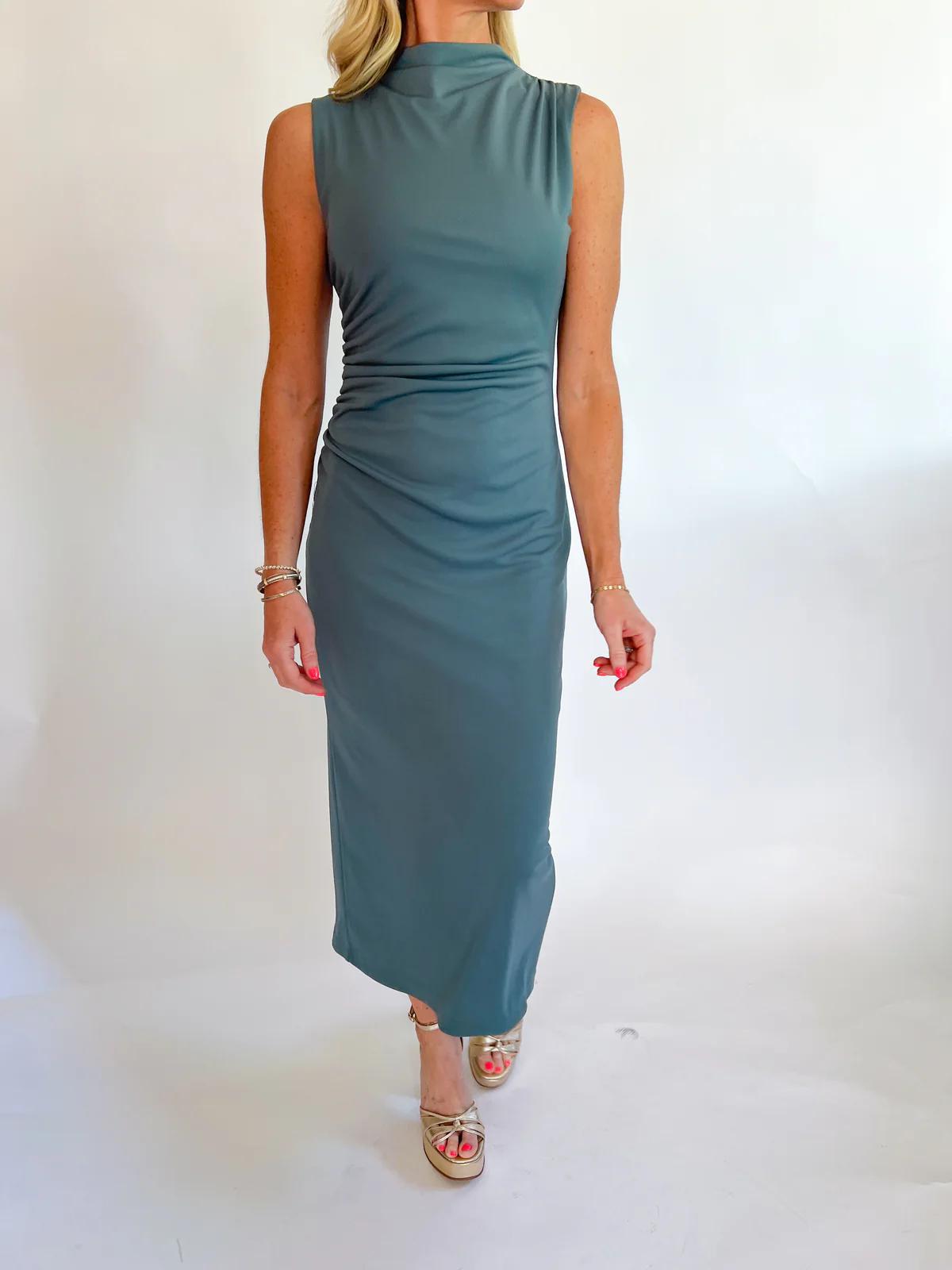 This dress features a mock neck and midi length, with a convenient back zipper closure. Its sleek fitted design makes it perfect for any formal occasion, while the zipper ensures a secure fit. Elevate your wardrobe with this elegant and stylish dress.